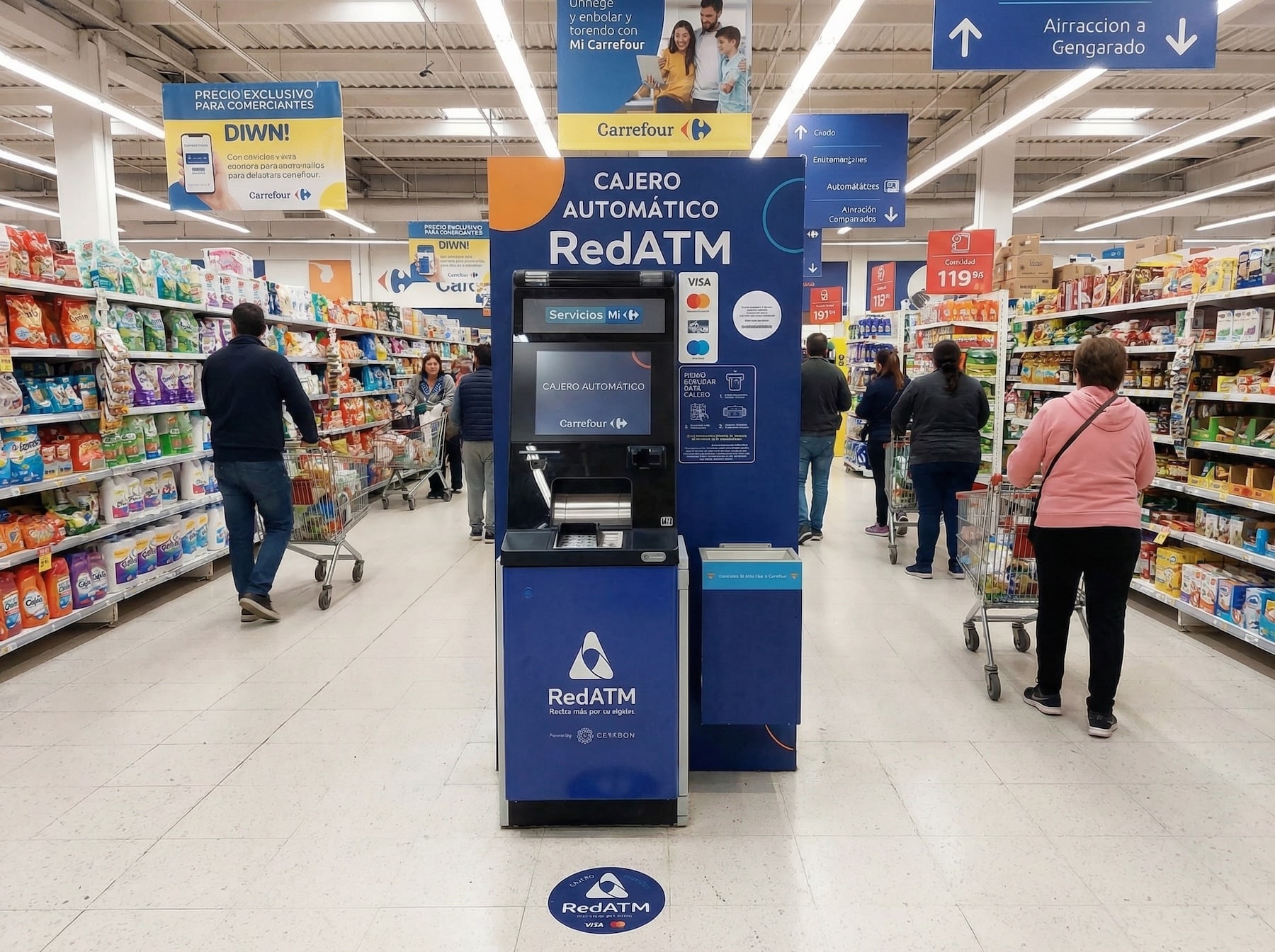 RedATM kiosks are available in many large Carrefour supermarkets across Argentina, typically near entrances or customer service desks.